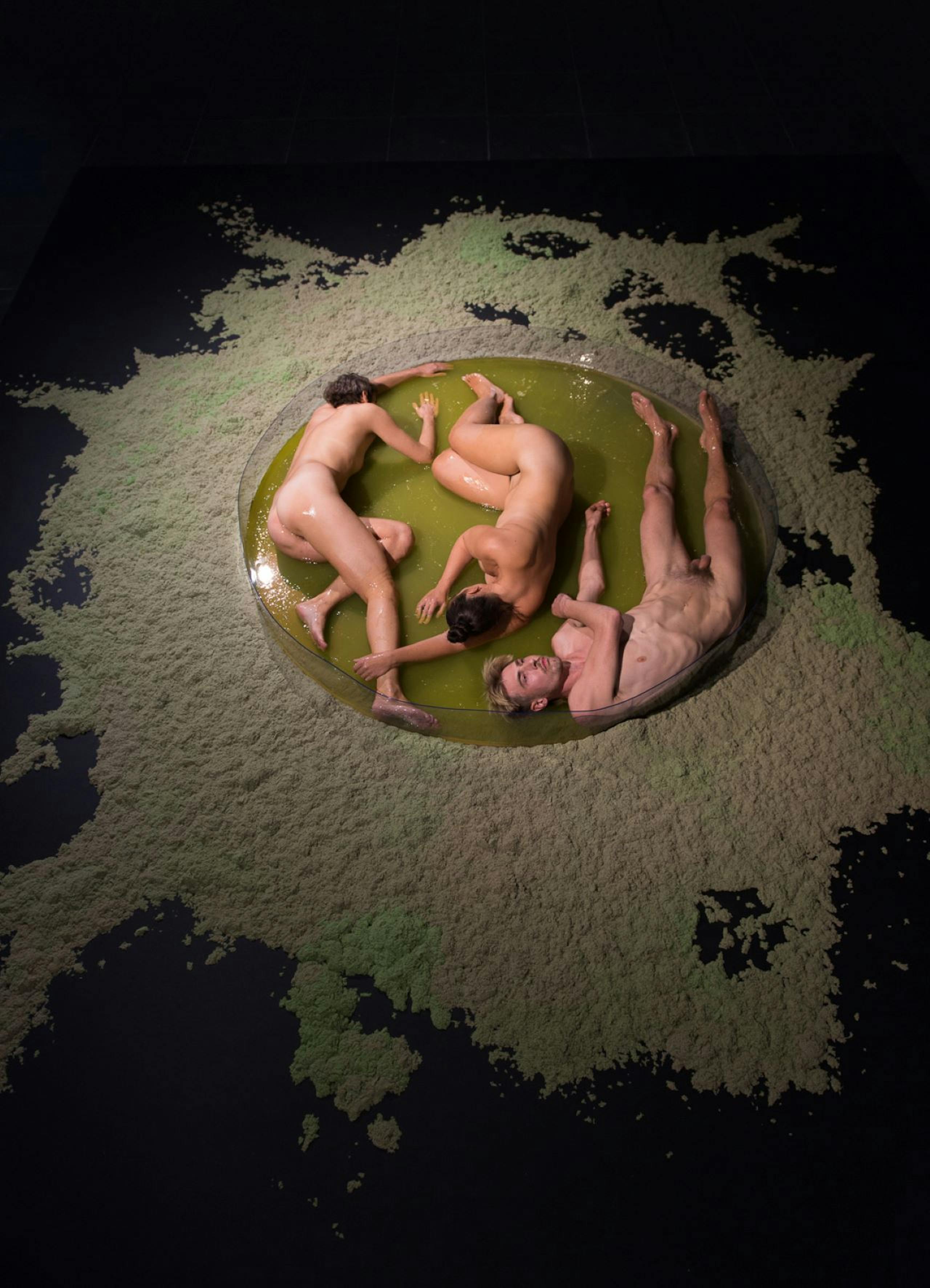 La scultura colossale di un’ameba, in scala 40.000:1, si protende in molteplici direzioni, collegandosi, pezzo per pezzo, ai frammenti trasparenti di una figura umana costellata di inclusioni microbiche. La proiezione dinamica di un’ameba reale si sovrappone all’installazione ed è accompagnata da suoni che veicolano la prorompente vitalità dell’universo microbico. L'installazione sarà animata dalla coreografa e performer Doris Uhlich in diverse occasioni.